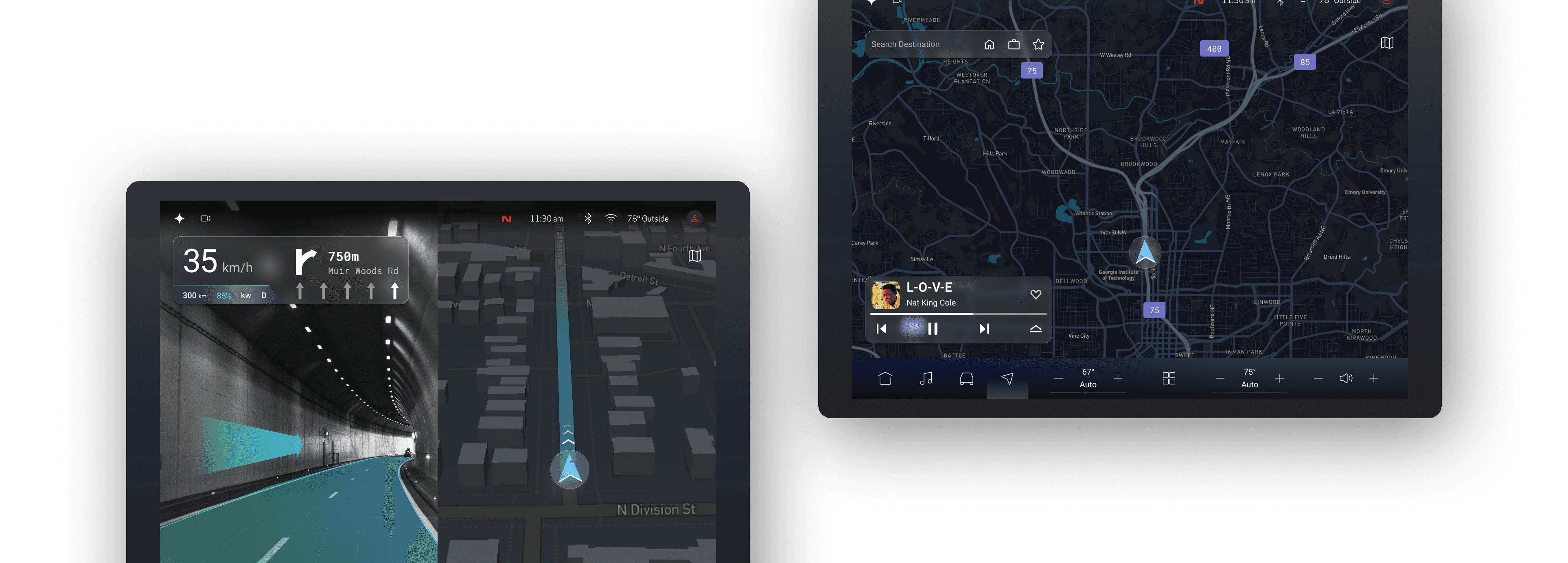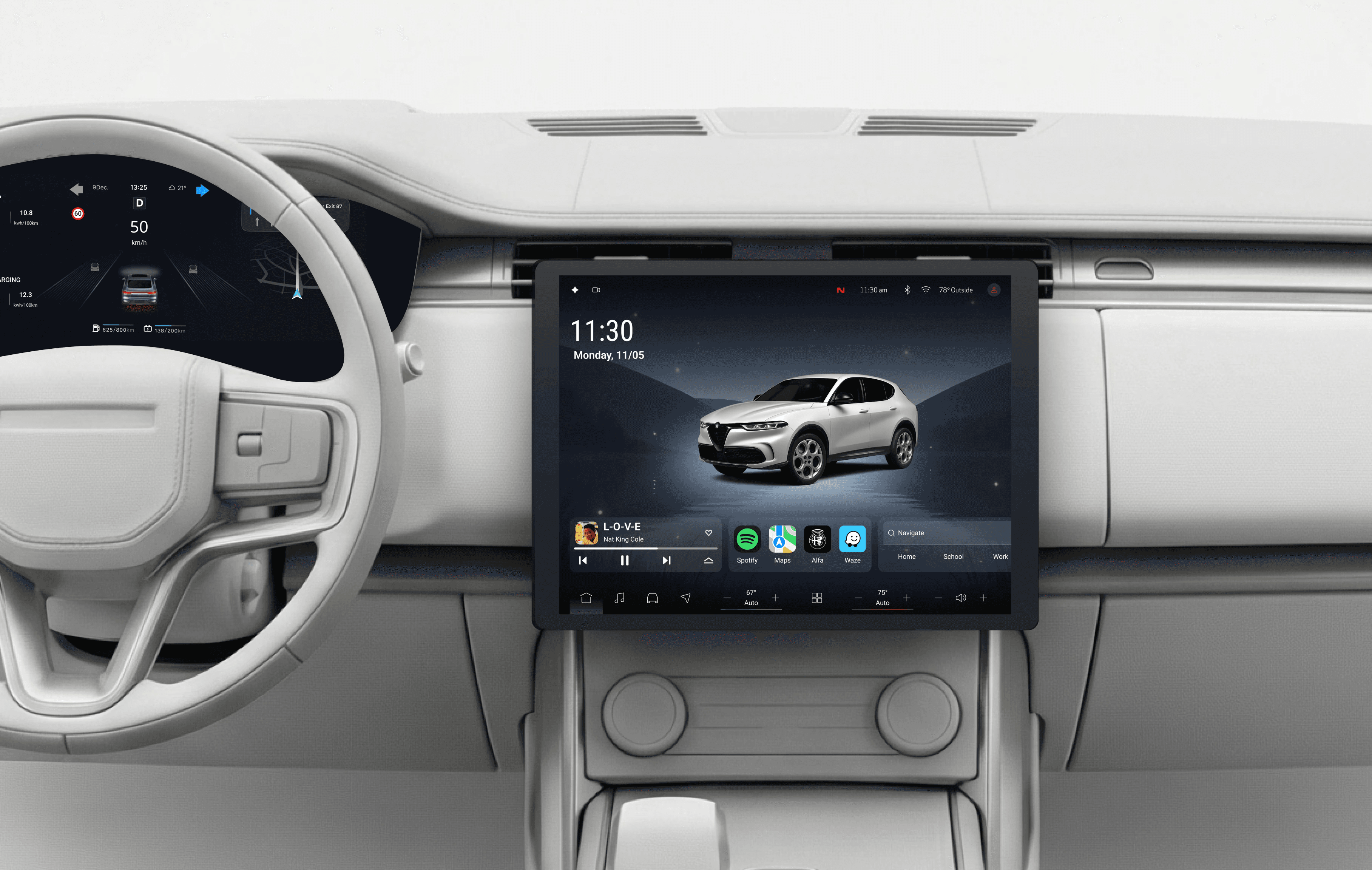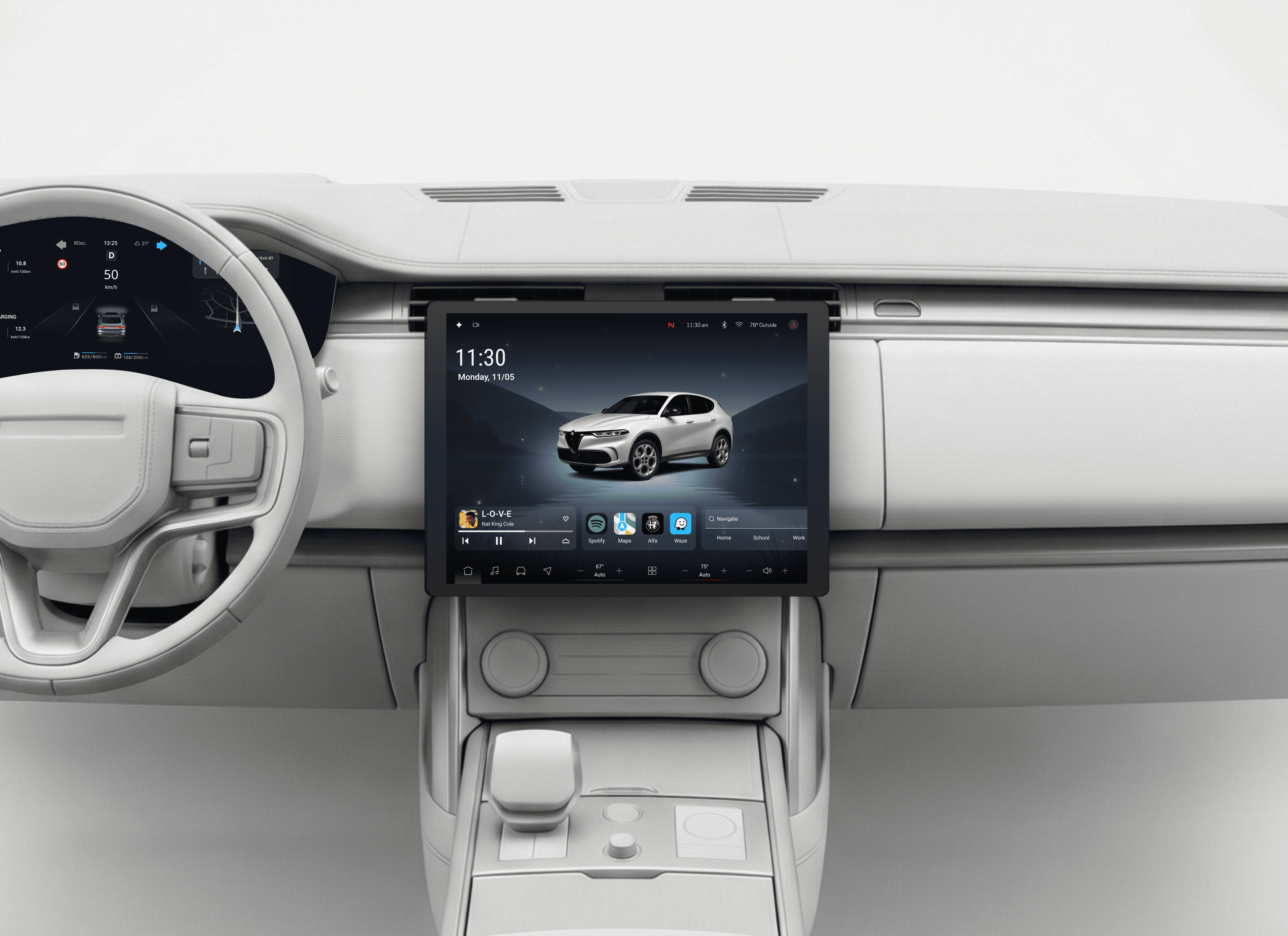The center display is the larger touchscreen in the middle of the dashboard, used to view and control navigation, media, and vehicle settings. As AI plays a growing role in the automotive industry, the designs also explore AI features in the interface.