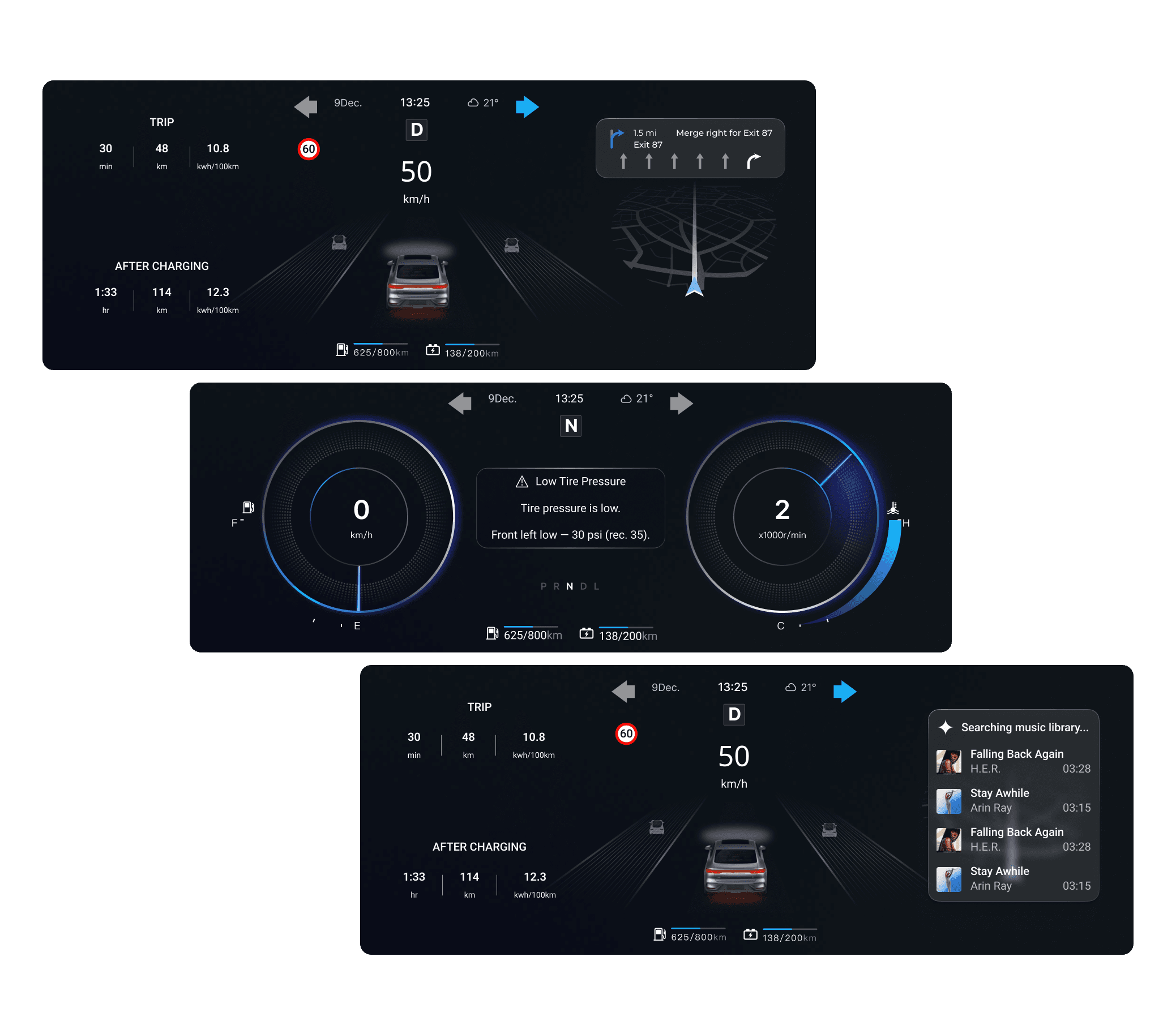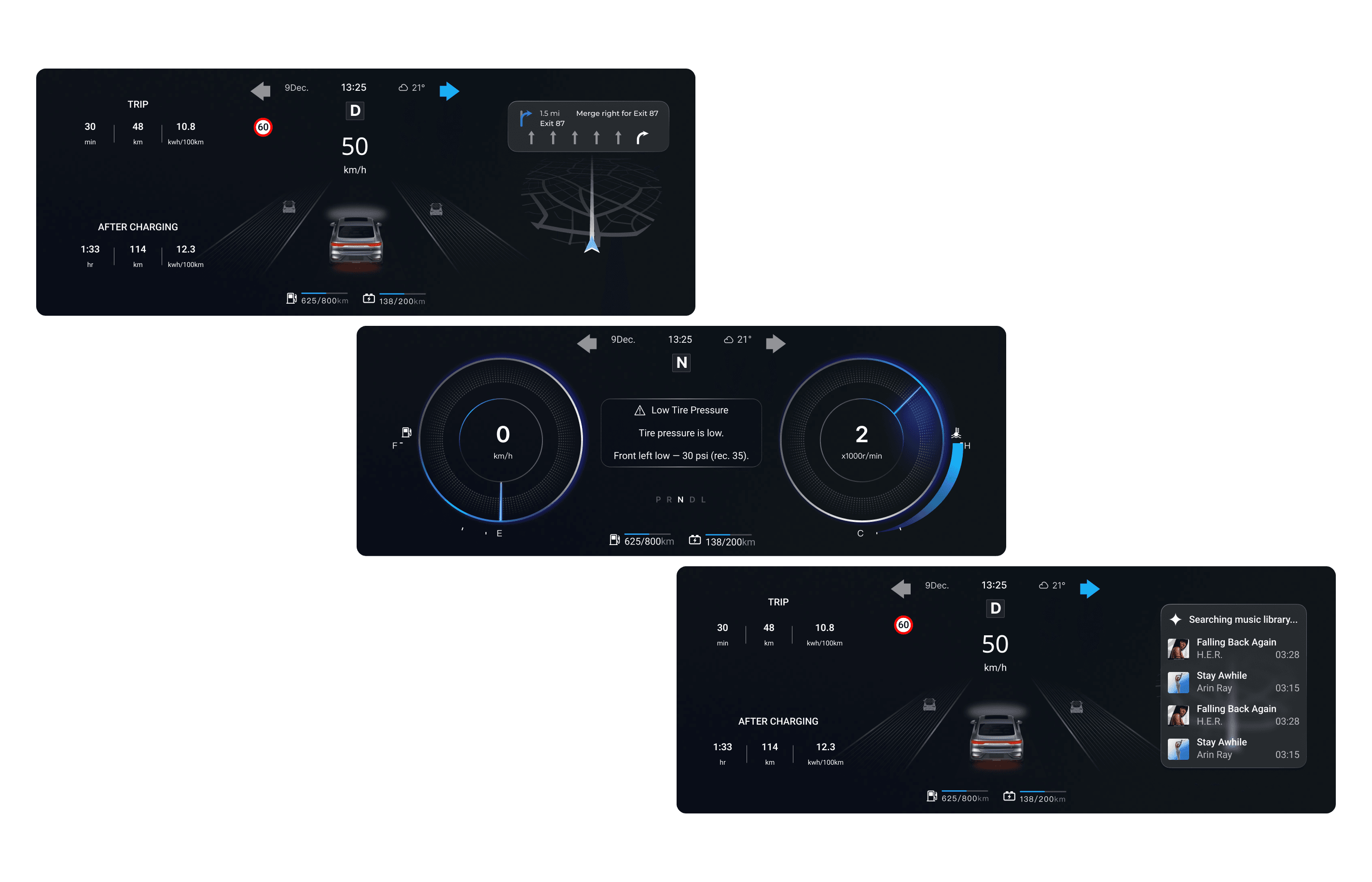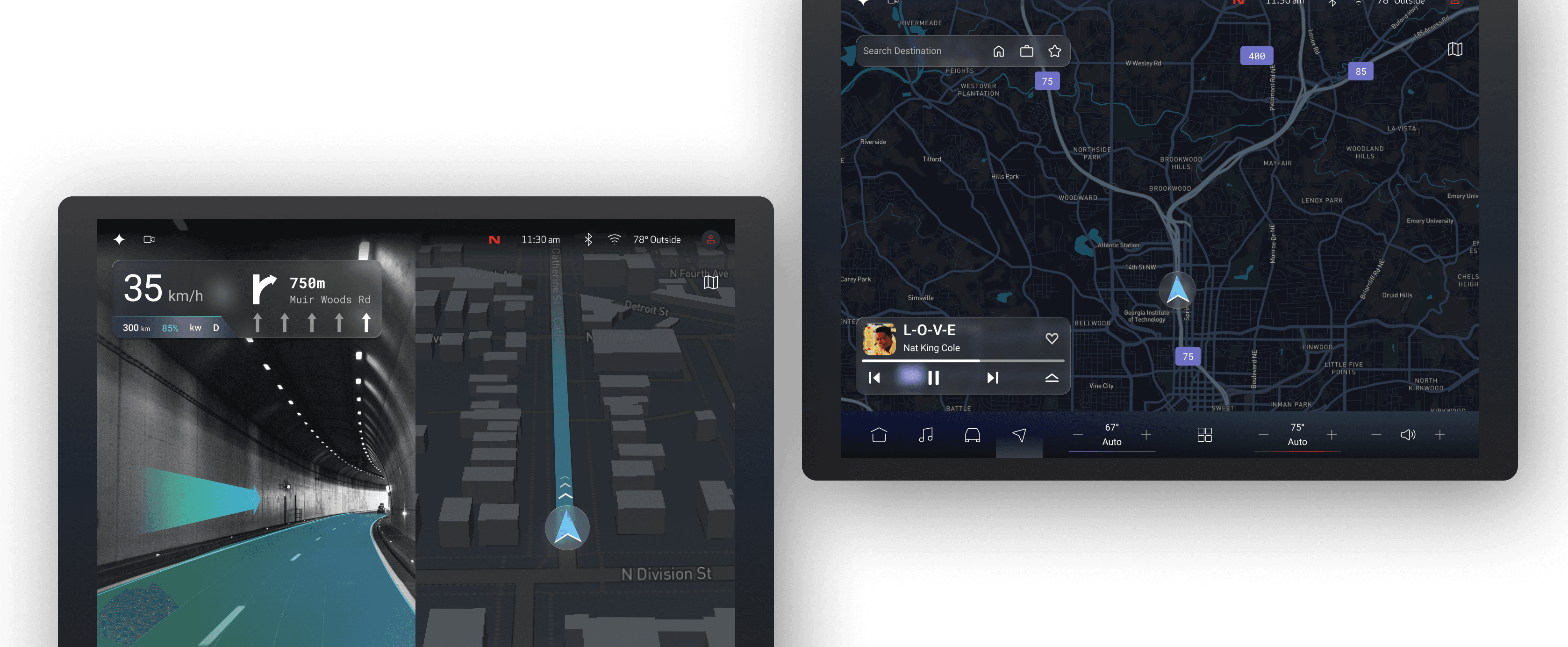 The center display is the larger touchscreen in the middle of the dashboard, used to view and control navigation, media, and vehicle settings. As AI plays a growing role in the automotive industry, the designs also explore AI features in the interface.