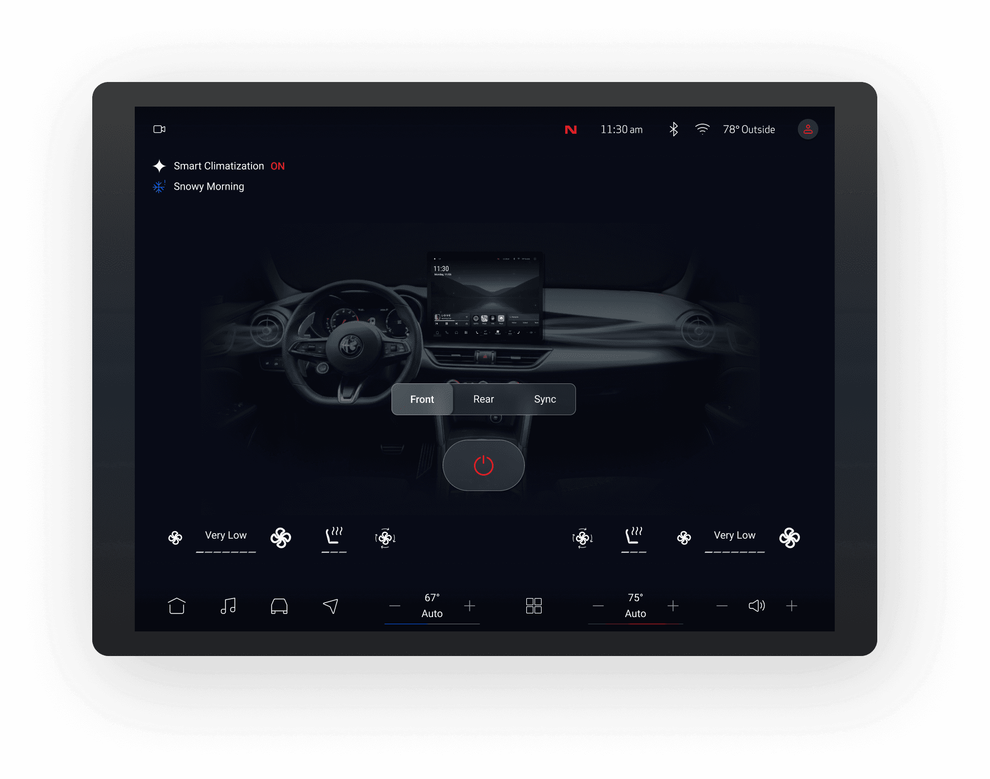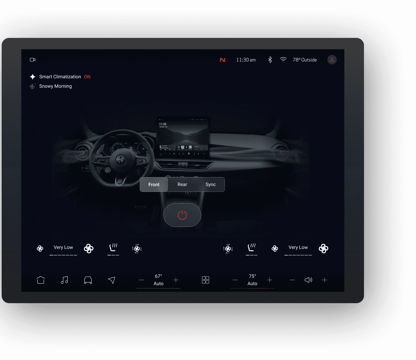 The landing page gives drivers an immediate overview of the system, showing navigation, media, and car status.