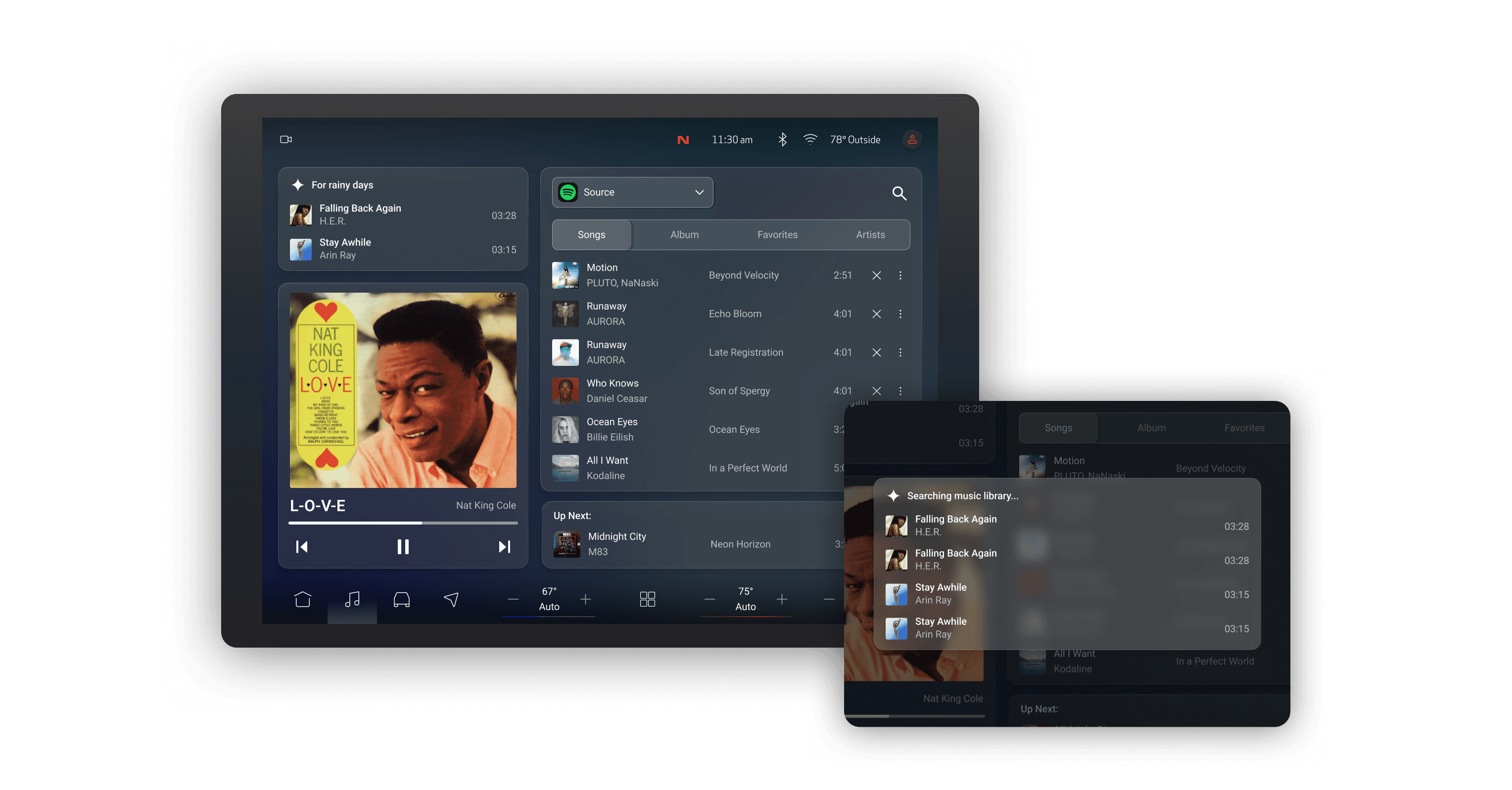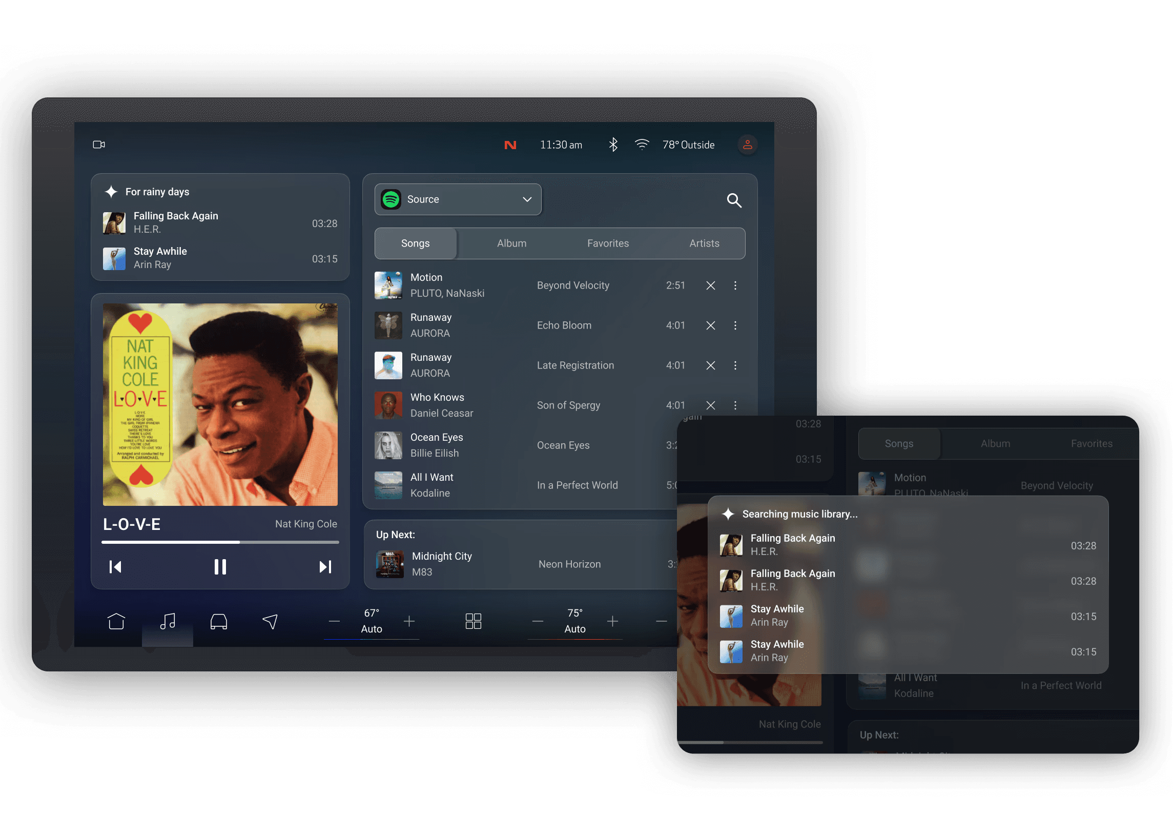 Media controls prioritize playback clarity, with personalized AI infotainment search shown on the right