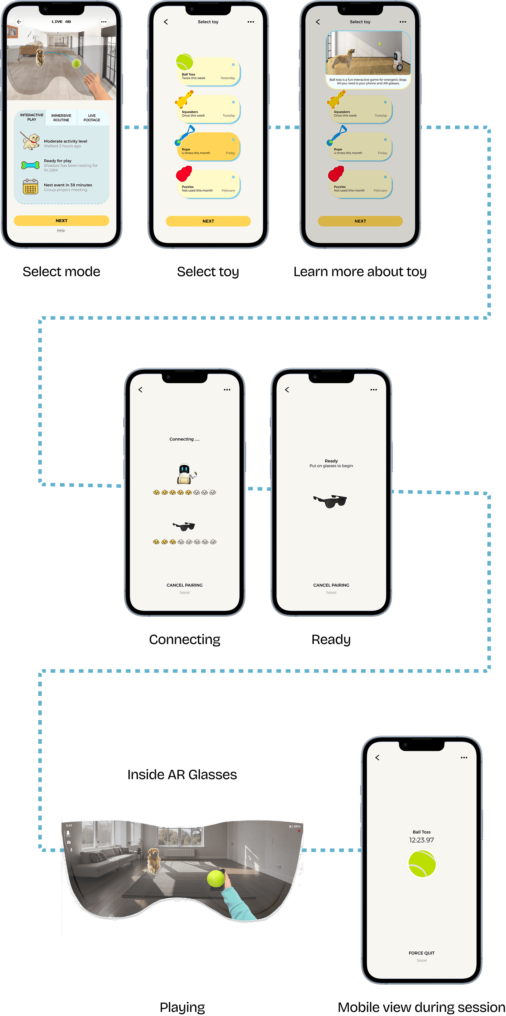 The phone app is an intermediary platform that facilities the connection between the robot and the glasses. The user flow diagram captures the basic structure and functions of the app.