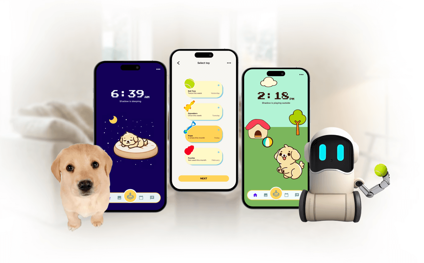An AI-driven companion that tracks the pet via camera and features a mechanical arm to facilitate physical play.